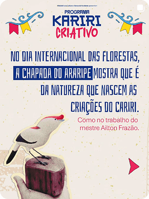O Programa Kariri Criativo - Apresentado pelo Ministério da Cultura através da Lei Rouanet, com patrocínio do Banco do Nordeste e realização da Quitanda Soluções Criativas, Governo do Ceará via Secretaria da Cultura, Ministério da Cultura e Governo Federal, o Kariri Criativo propõe um modelo inovador, inclusivo e enraizado na diversidade cultural.